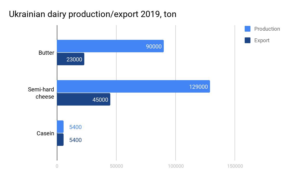 また、日本の企業がウクライナの乳製品を知るサポートをしたいと考えています。いくつかの乳製品の生産と輸出に関する一般的な概要情報。(図2を参照) 図からも分かるように、ウクライナは主要な乳製品をかなりの量輸出しており、外国との取引は日常的に行われております。